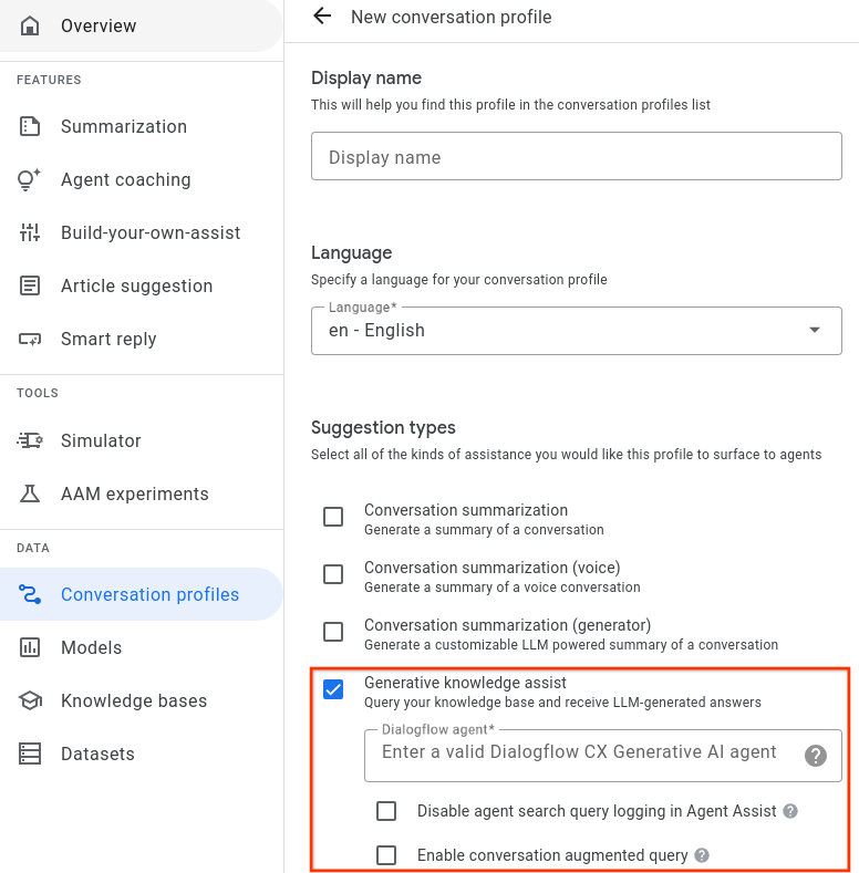 Agent Assist コンソールで会話プロファイルを作成すると、生成ナレッジ アシストとプロアクティブ生成ナレッジ アシストの両方が自動的に有効になります。プロアクティブな生成ナレッジ アシストを無効にするには、API を使用して会話プロファイルを作成する必要があります。