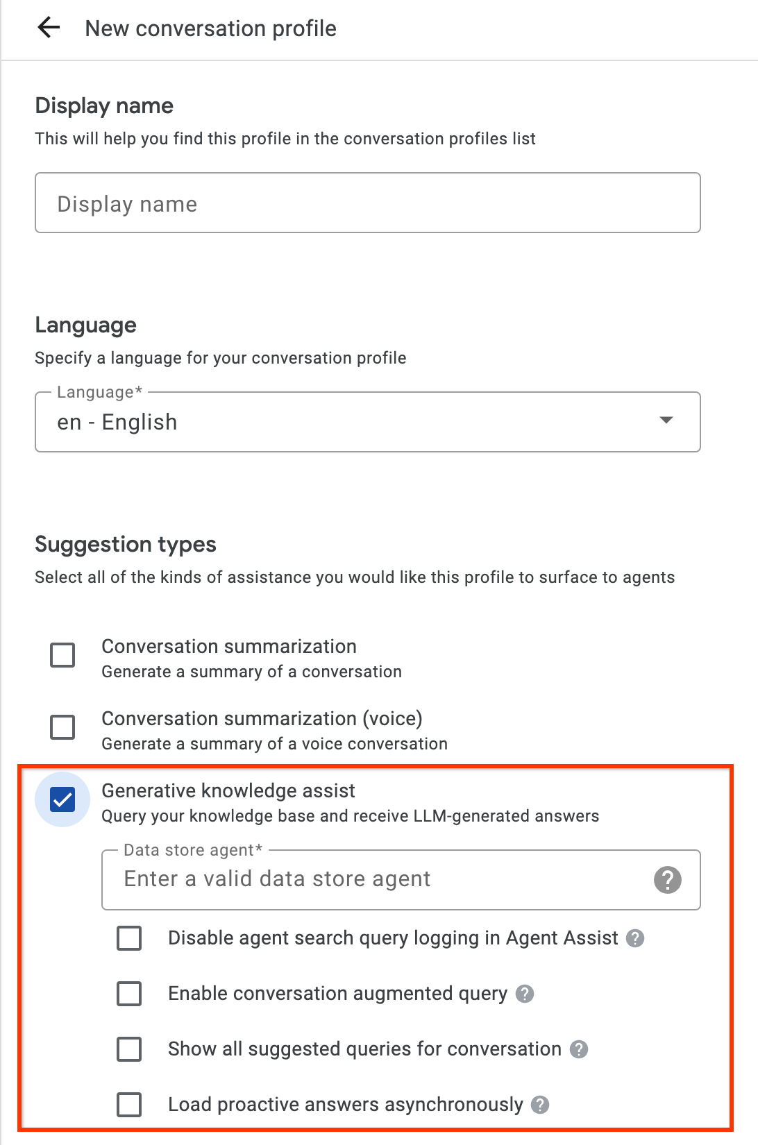 - You must enable the generative knowledge assist suggestion type and link it to the flow-based or playbook-based data store agent from the previous step.