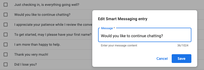 Agent Assist コンソールを使用してスマート リプライ モデルを作成すると、作成プロセスで、会話中にエージェントに表示できる候補のリストも生成されます。このリソースは許可リスト と呼ばれます。許可リストには、選択した会話データセットを使用して生成されたすべての候補が含まれています。