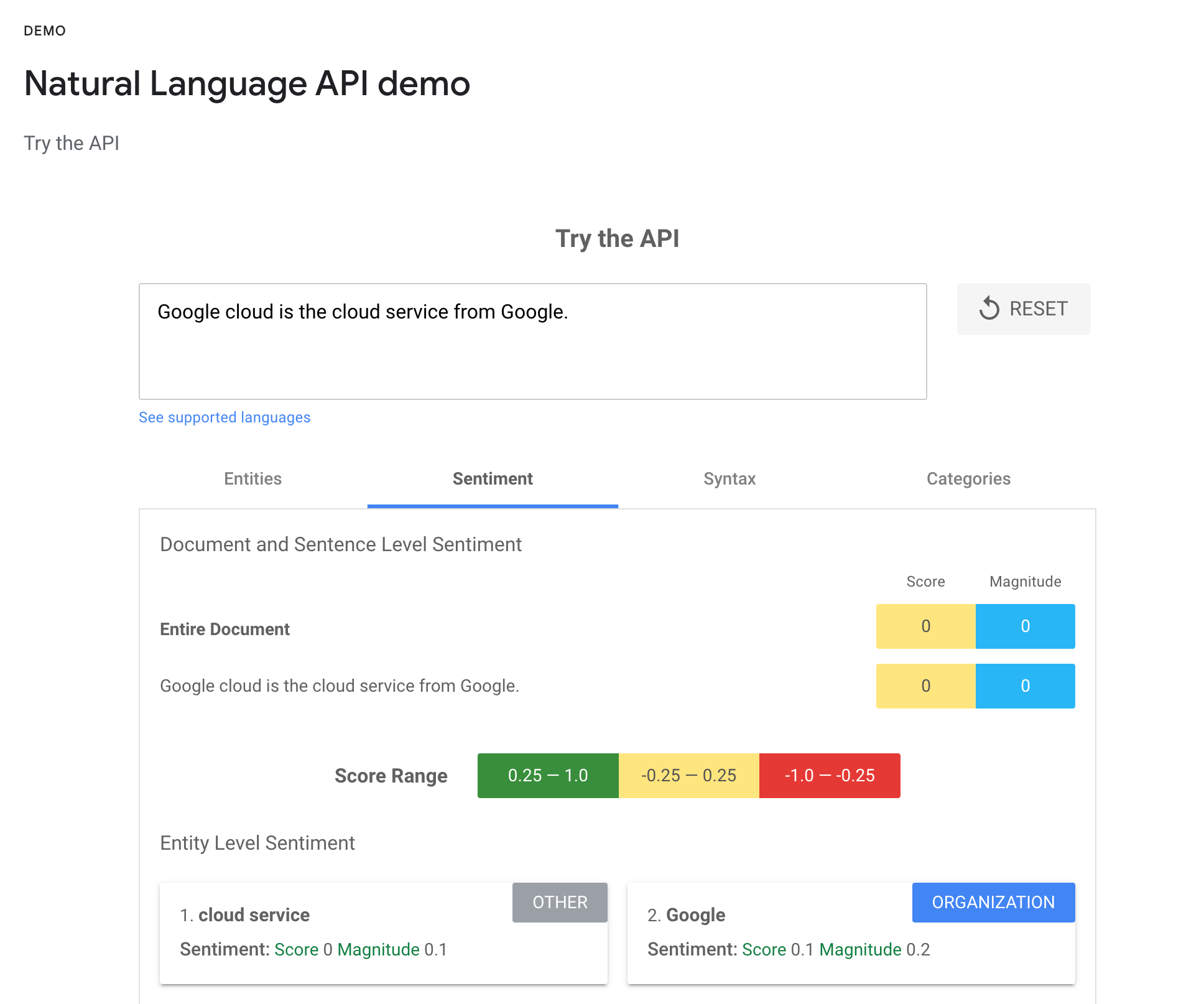 El sentimiento score devuelto para todo el documento es 0, mientras que el magnitude es 1,6. Un score de 0 en un documento con varias frases puede significar que es realmente neutral desde el punto de vista emocional o que las tendencias emocionales positivas y negativas en varios puntos del texto se han anulado entre sí. El texto con un sentimiento verdaderamente neutro también tendrá un magnitude igual o cercano a 0. En este caso, el magnitude relativamente alto de 1,6 significa que el sentimiento de las dos frases no es realmente neutro, sino mixto (por ejemplo, enfado, decepción y alegría en varios puntos del texto). Si observamos los valores de score de cada frase, una es muy positiva (0,8) y la otra es muy negativa (-0,8), lo que ha provocado que el valor de score de todo el documento sea 0.