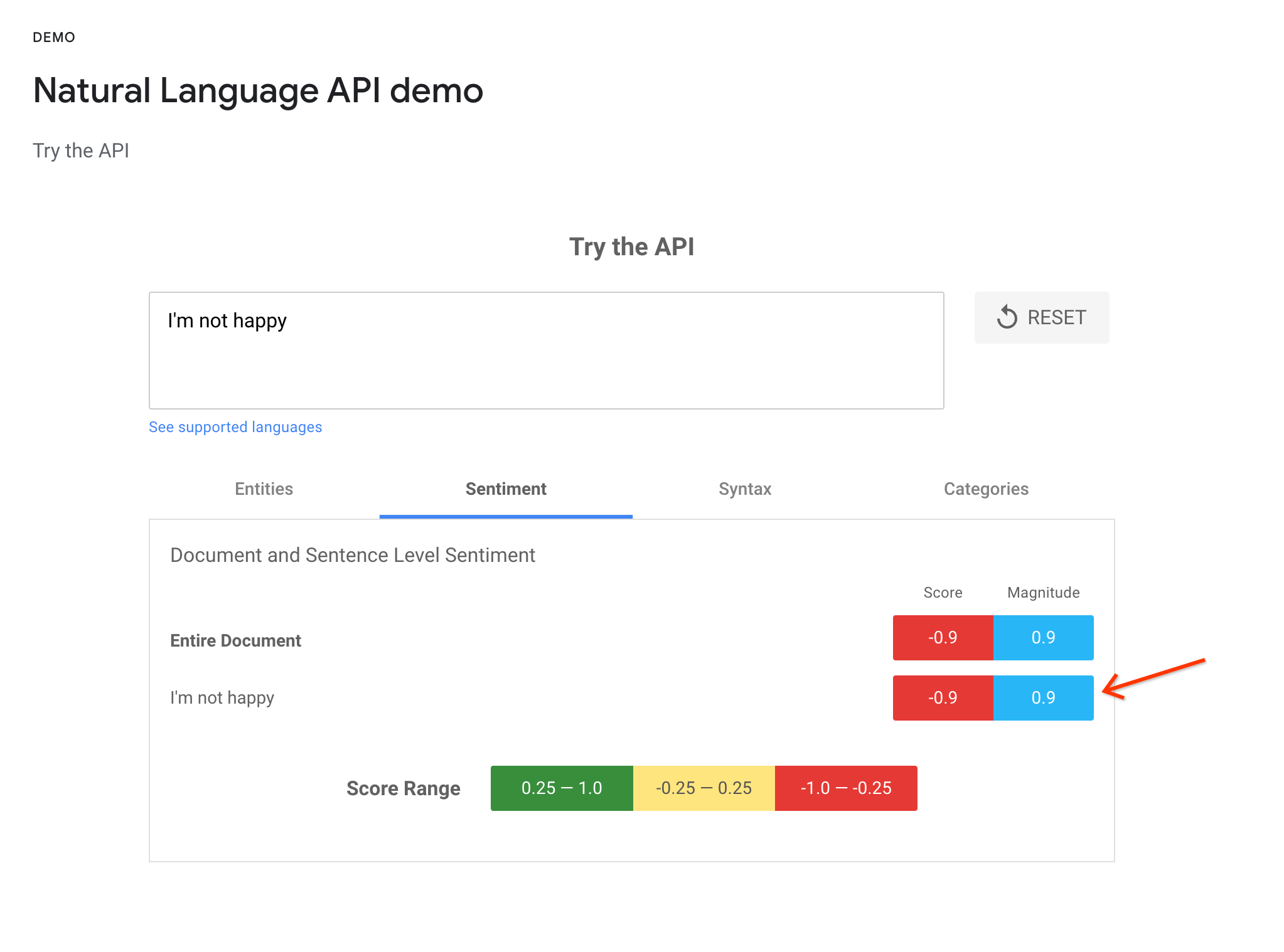 magnitude é 1,6. Uma score de 0 num documento com várias frases pode significar que é verdadeiramente neutro do ponto de vista emocional ou que as tendências emocionais positivas e negativas em vários pontos do texto anularam-se mutuamente. O texto com um sentimento verdadeiramente neutro também tem um magnitude igual ou próximo de 0. Neste caso, o valor relativamente elevado de magnitude de 1,6 significa que o sentimento das duas frases não é verdadeiramente neutro, mas misto (por exemplo, raiva, desilusão e felicidade em vários pontos do texto). Analisando os valores de score para cada frase, uma é fortemente positiva (0,8) e a outra é fortemente negativa (-0,8), o que fez com que a média de score de todo o documento fosse 0.