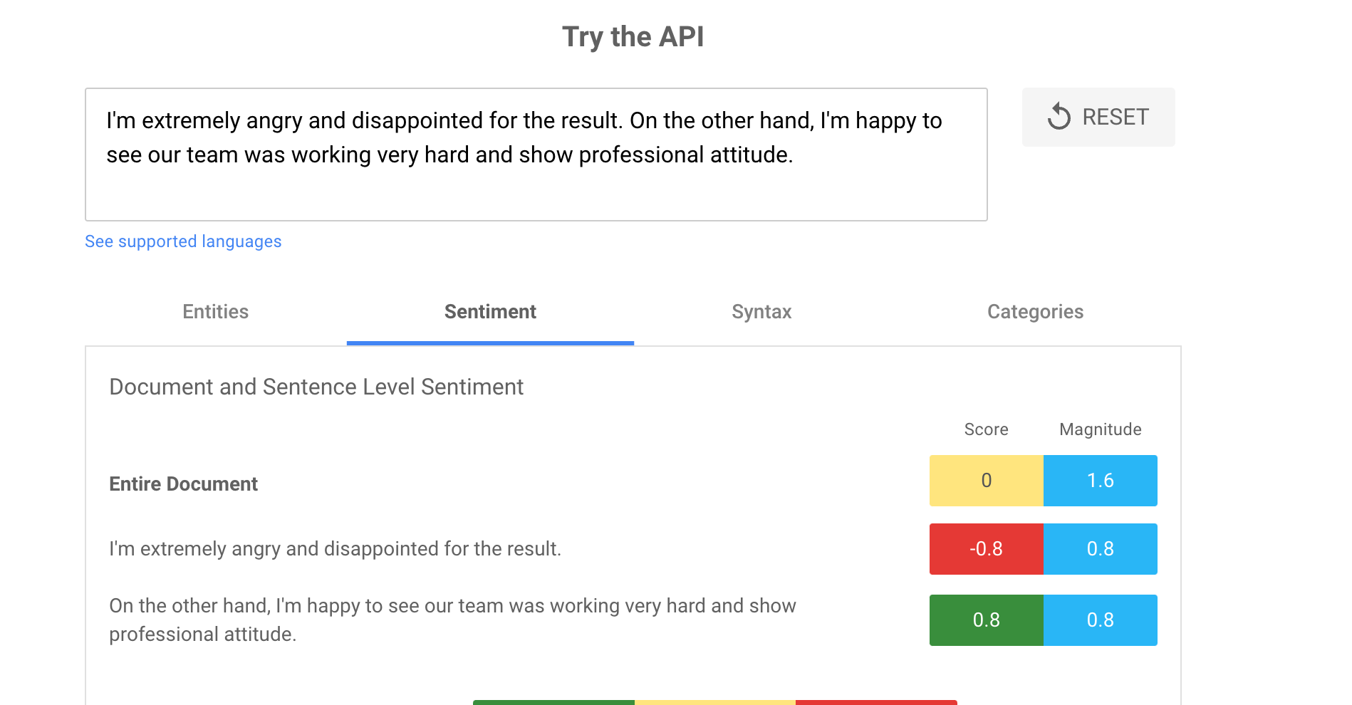 magnitude é 1,6. Uma score de 0 num documento com várias frases pode significar que é verdadeiramente neutro do ponto de vista emocional ou que as tendências emocionais positivas e negativas em vários pontos do texto anularam-se mutuamente. O texto com um sentimento verdadeiramente neutro também tem um magnitude igual ou próximo de 0. Neste caso, o valor relativamente elevado de magnitude de 1,6 significa que o sentimento das duas frases não é verdadeiramente neutro, mas misto (por exemplo, raiva, desilusão e felicidade em vários pontos do texto). Analisando os valores de score para cada frase, uma é fortemente positiva (0,8) e a outra é fortemente negativa (-0,8), o que fez com que a média de score de todo o documento fosse 0.