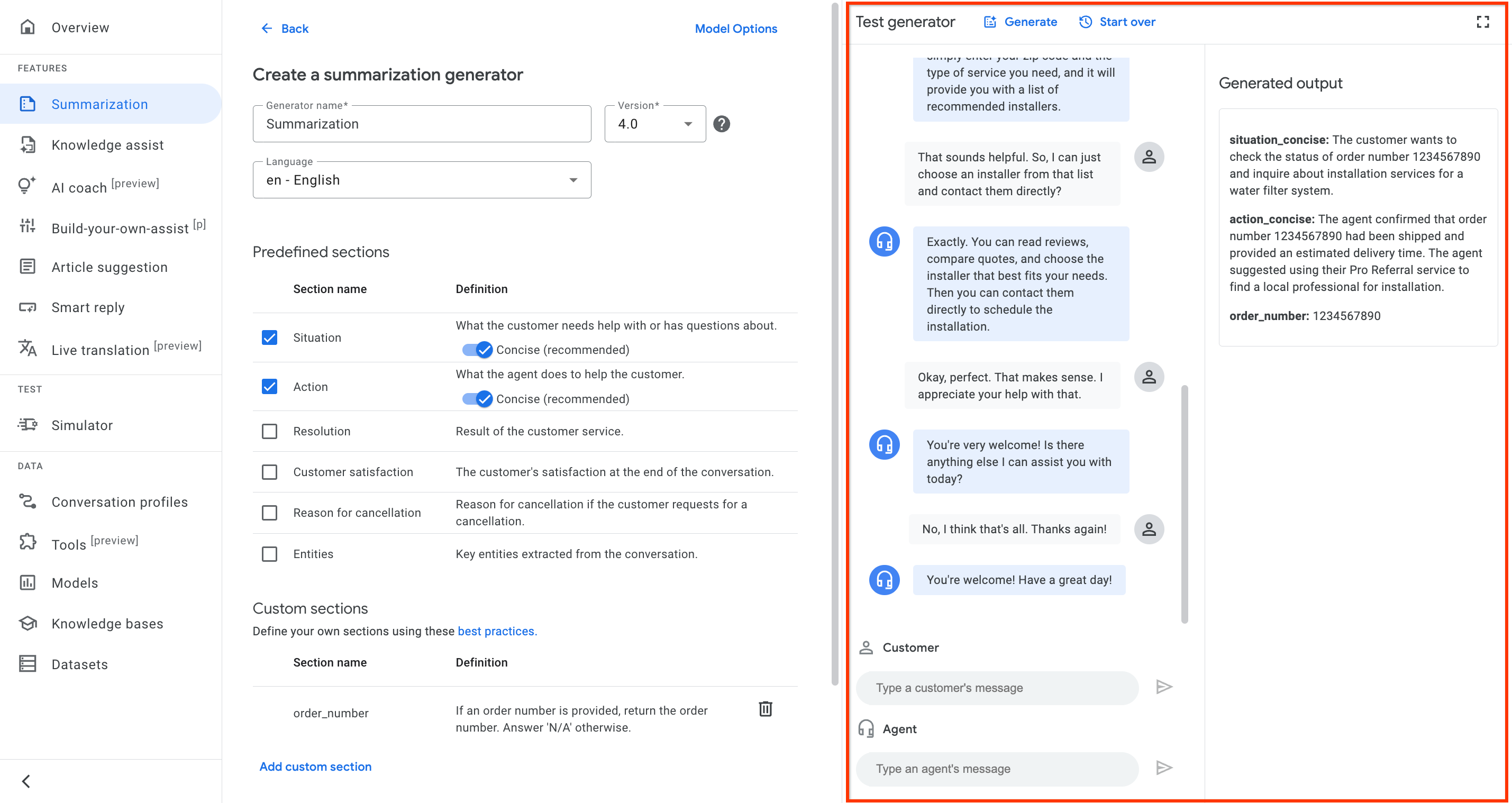 O resumo com seções personalizadas usa um LLM para resumir conversas de atendimento ao cliente. O modelo recebe as conversas e seções personalizadas, que são partes de comandos de texto que definem a tarefa realizada pelo modelo, para gerar os resumos.