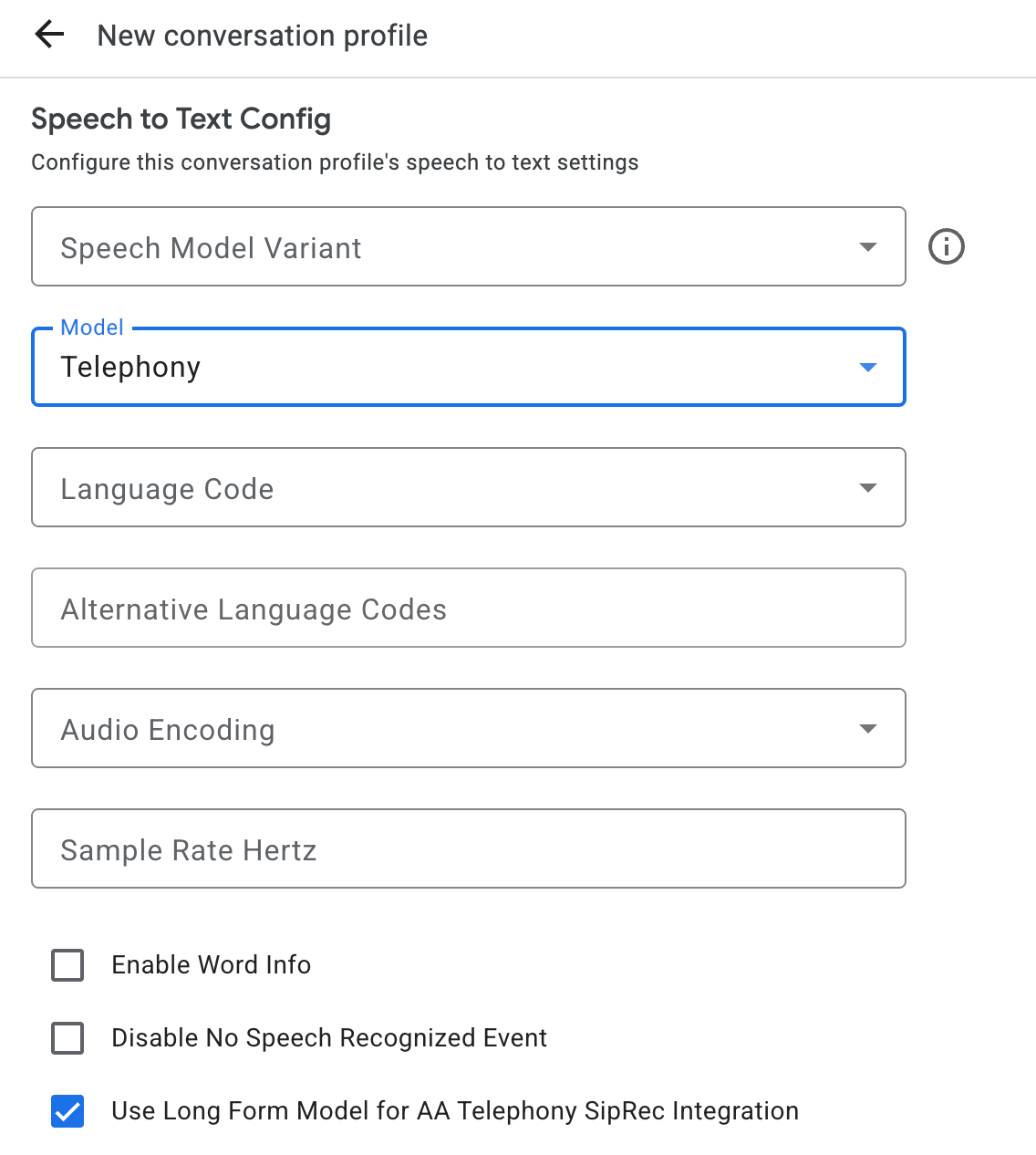 InputAudioConfig. (Les champs configurés ici remplacent les paramètres correspondants dansConversationProfile.stt_config.) N'envoyez aucune entrée audio avant la deuxième requête.audioEncodingdoit être défini surAUDIO_ENCODING_LINEAR_16ouAUDIO_ENCODING_MULAW.model: modèle Speech-to-Text que vous souhaitez utiliser pour transcrire votre contenu audio. Définissez ce champ surchirp_3. La variante n'a pas d'incidence sur la qualité de la transcription. Vous pouvez donc laisser le champ Variante du modèle vocal non spécifié ou choisir Utiliser la meilleure variante disponible.singleUtterancedoit être défini surfalsepour une qualité de transcription optimale. Vous ne devez pas vous attendre àEND_OF_SINGLE_UTTERANCEsisingleUtteranceestfalse, mais vous pouvez compter surisFinal==trueà l'intérieur deStreamingAnalyzeContentResponse.recognition_resultpour fermer le flux à moitié.- Paramètres facultatifs supplémentaires : les paramètres suivants sont facultatifs. Pour accéder à ces paramètres, contactez votre représentant Google.
