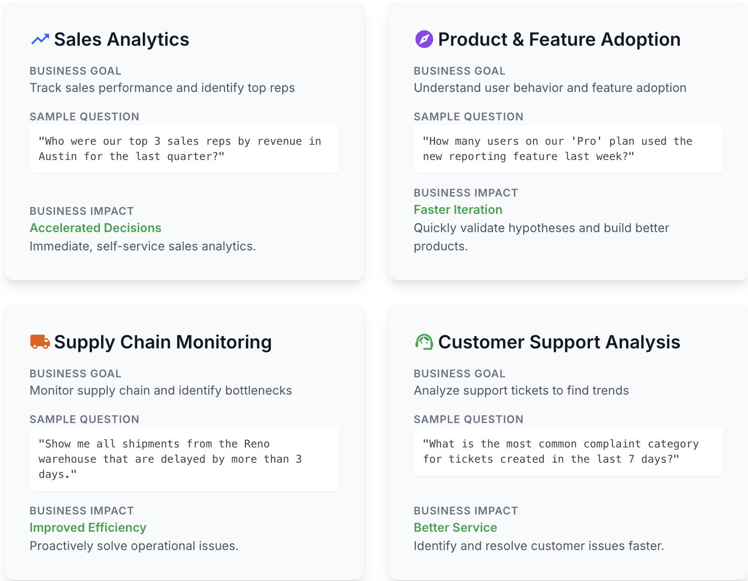 Adoption des produits Comprendre le comportement des utilisateurs et l'adoption des fonctionnalités "How many users on our 'Pro' plan used the new reporting feature last week?" - Itération plus rapide