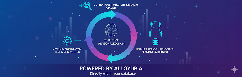 推薦引擎使用超快速向量搜尋,直接在資料庫中找出類似項目或使用者 (最鄰近),實現即時個人化,提供動態且相關的建議。