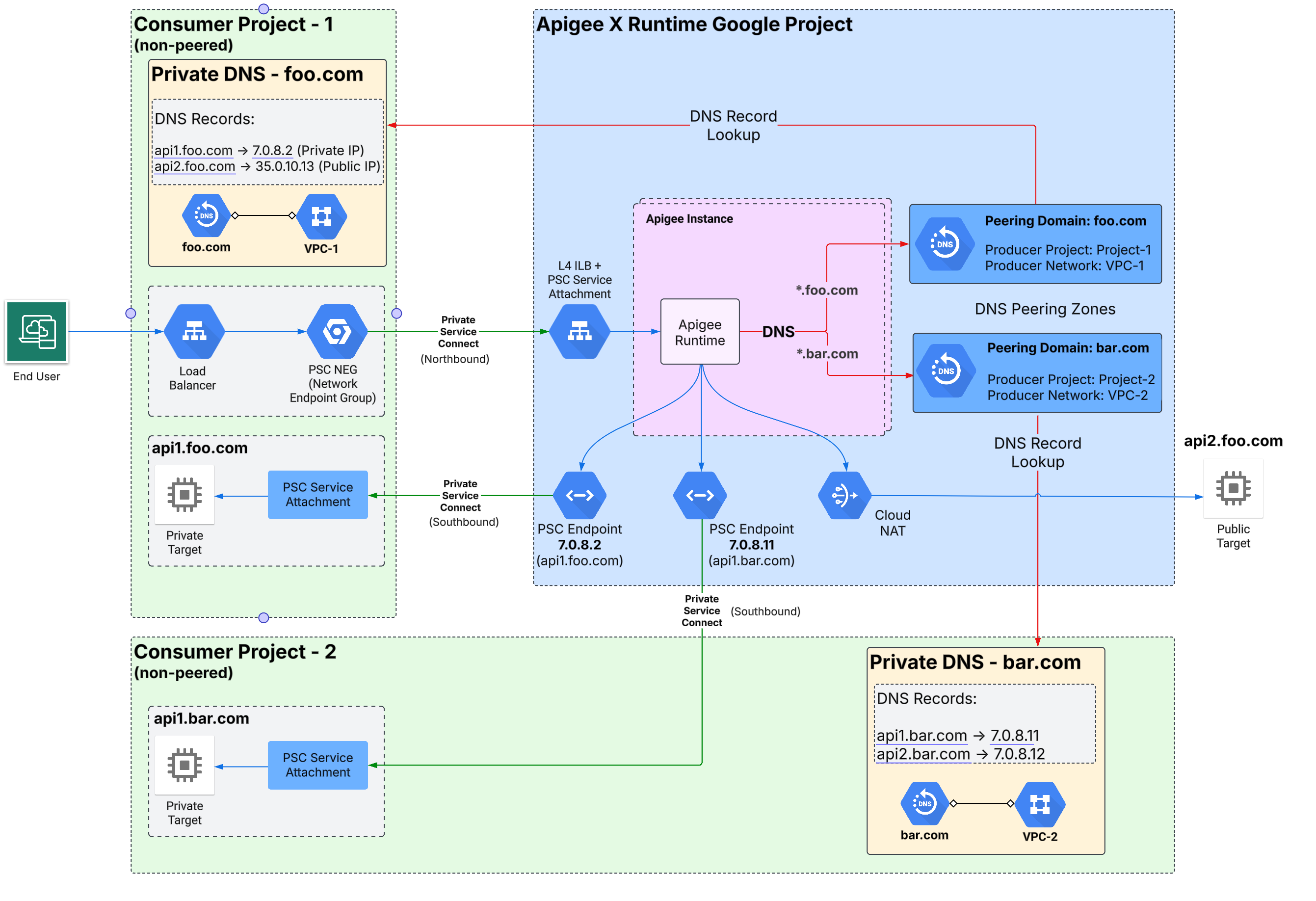 Damit Apigee seine Aufgabe erfüllen kann, muss es eine Verbindung zu Backend-Zielen herstellen, die Sie verwalten. Diese Ziele können über einen öffentlichen oder privaten DNS aufgelöst werden. Wenn das Ziel öffentlich auflösbar ist, gibt es kein Problem. Das Apigee-Backend-Ziel verweist auf die öffentliche Adresse des Dienstes. Private Endpunkte können statische IP-Adressen oder auflösbare DNS-Namen sein, die Sie hosten und verwalten. Zum Auflösen privater Zielendpunkte ist es üblich, eine private DNS-Zone in Ihrem Google Cloud-Projekt zu hosten. Standardmäßig können diese privaten DNS-Namen nicht von Apigee aufgelöst werden.