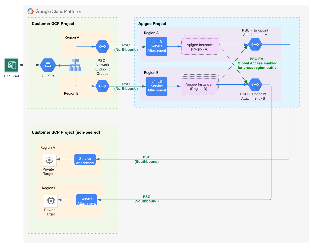 이 문서에서는 Private Service Connect(PSC)를 사용하여 Apigee와 백엔드 대상 서비스 간에 비공개 연결을 만드는 방법을 설명합니다. Apigee와 백엔드 대상 서비스 간에 전달되는 API 프록시 트래픽을 "southbound" 트래픽이라고 합니다.