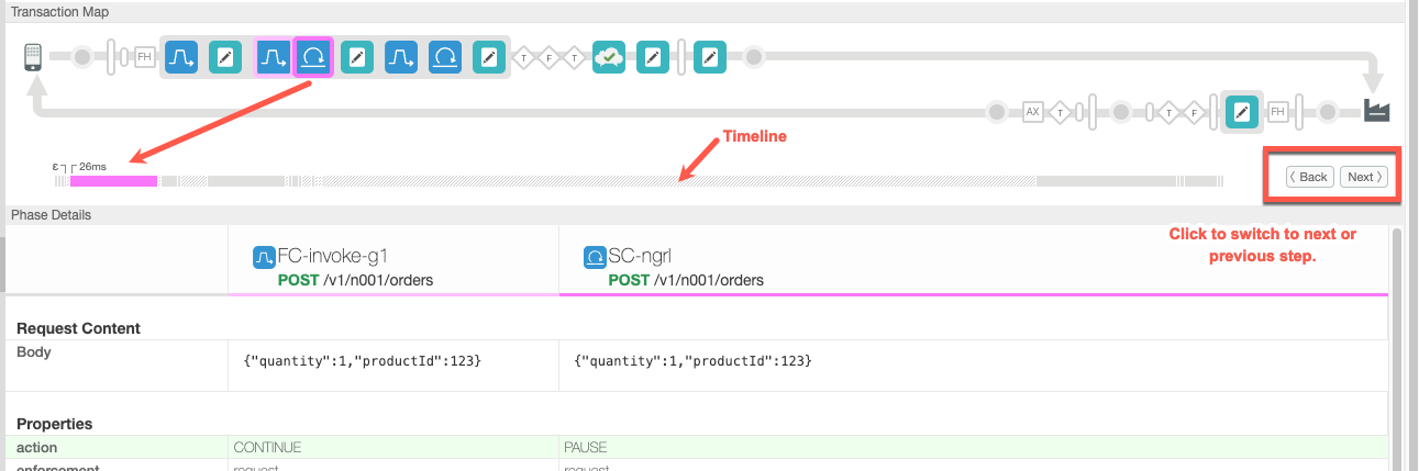 Además, la IU muestra los datos de depuración en las secciones Mapa de transacciones y Detalles de la fase del panel Enviar solicitudes, y propaga las secciones Extremo del proxy, Encabezados de la solicitud, Contenido de la solicitud y Propiedades, como se muestra en el siguiente ejemplo: