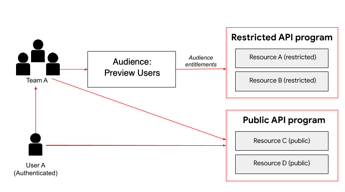 如圖所示,使用者 A 是通過驗證的入口網站使用者,因此可以存取公開 API 計畫提供的資源。此外,使用者 A 是「團隊 A」的成員,因此會繼承「搶先體驗使用者」目標對象的權利,並可存取這個受限 API 計畫提供的資源。