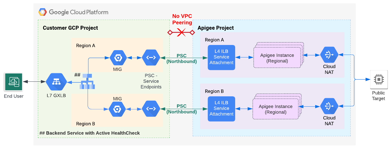 If you plan to use PSC for Apigee northbound network routing, follow the instructions in this document to configure active health check. At this time PSC does not support active health check monitoring, but you can modify the Apigee configuration to use a managed instance group (MIG), which does provide active health check capability.