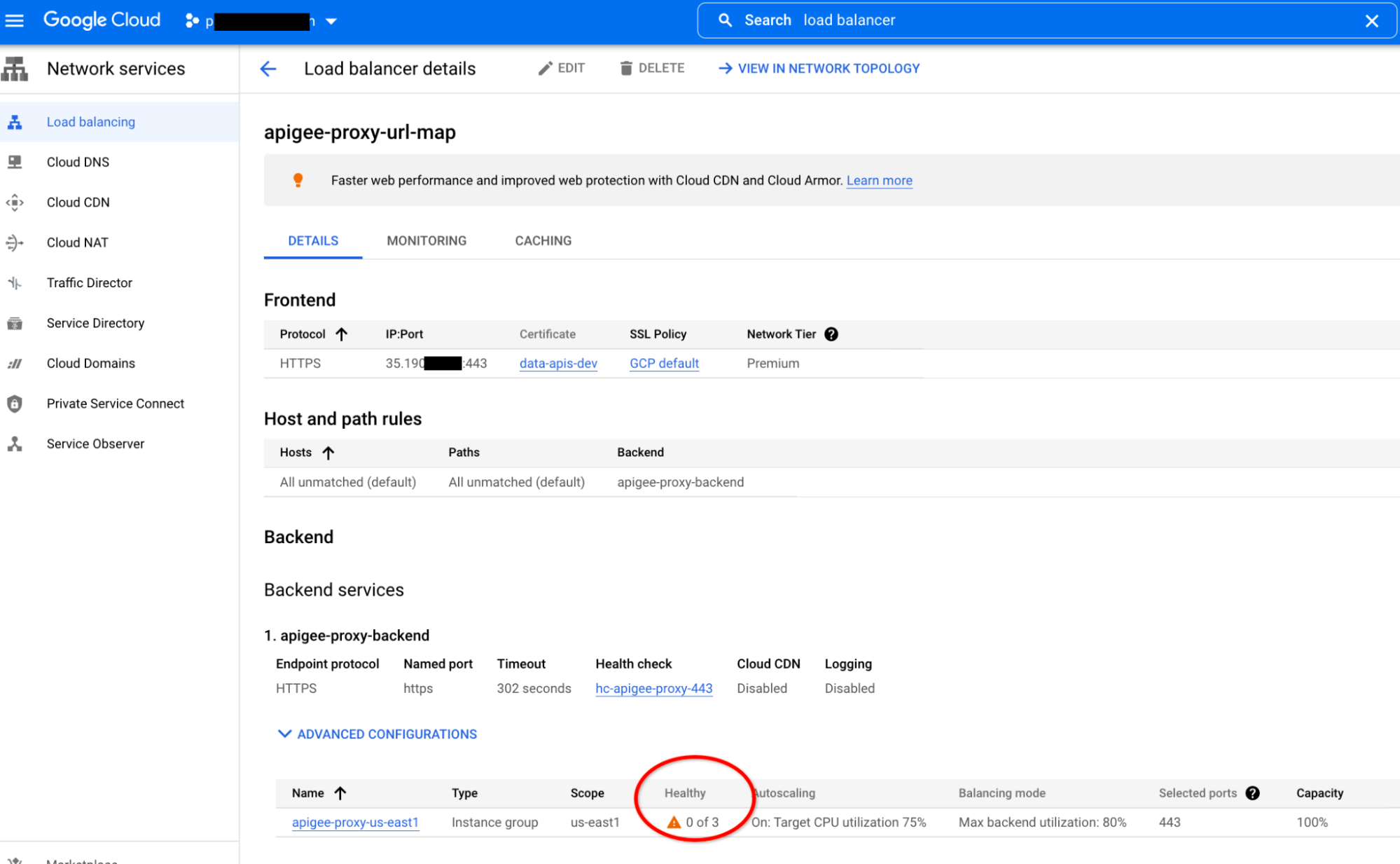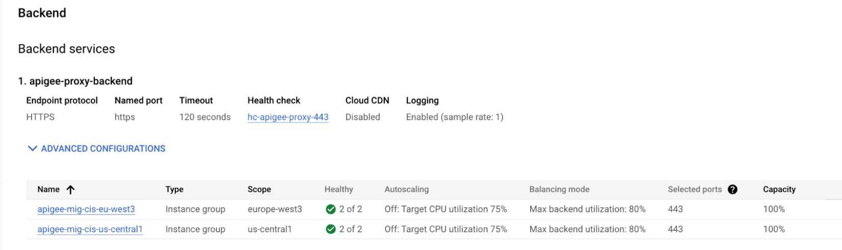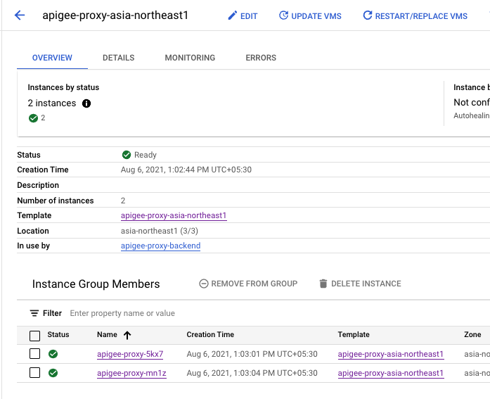 apigee-proxyprefix) running in a managed instance group (MIG) that forward the traffic to the Apigee instance. If you are seeing messages like the above, check the health of theapigee-proxyVMs part of the instance group through the following steps:-