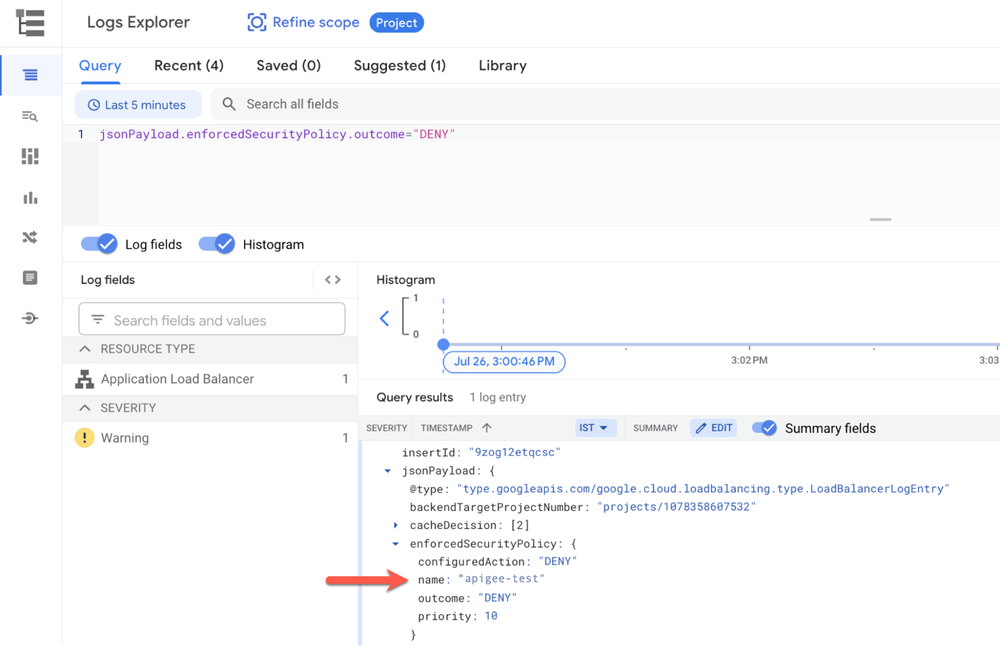 Once logging is enabled, perform a logs query to find any requests blocked by Google Cloud Armor policies: