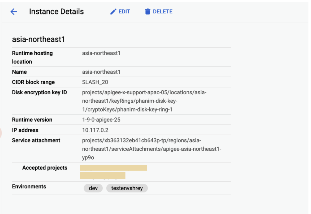 locationabaixo. Por exemplo,asia-northeast1."instances": [ { "name": "asia-northeast1", "location": "asia-northeast1", "host": "10.117.0.2", "port": "443", "createdAt": "1628150049760", "lastModifiedAt": "1682139265367", "diskEncryptionKeyName": "projects/apigee-x-support-apac-05/locations/asia-northeast1/keyRings/phanim-disk-key-1/cryptoKeys/phanim-disk-key-ring-1", "state": "ACTIVE", "peeringCidrRange": "SLASH_20", "runtimeVersion": "1-9-0-apigee-25", "consumerAcceptList": [ "example-apigee-support", "example-neg-project" ], "serviceAttachment": "projects/xb363132eb41cb643p-tp/regions/asia-northeast1/serviceAttachments/apigee-asia-northeast1-yp9o" }