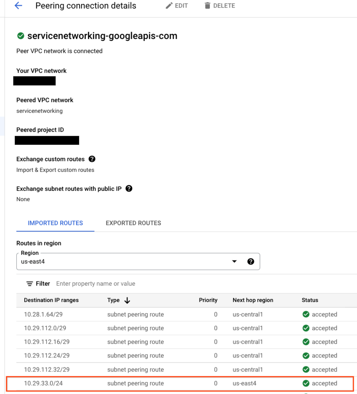 2. Selecione a conexão de peering da rede VPC. Por exemplo, servicenetworking-googleapis-com. A página Detalhes da conexão de peering é aberta: