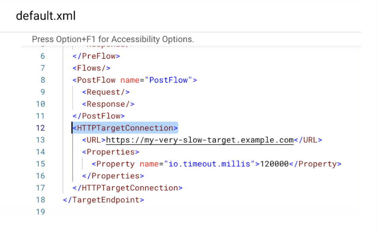 io.timeout.millisproperty under the<HTTPTargetConnection>element and specify the new time limit in milliseconds, for example:<HTTPTargetConnection> <URL>https://my-very-slow-target.example.com</URL> <Properties> <Property name="io.timeout.millis">120000</Property> </Properties> </HTTPTargetConnection>In the example above the timeout is increased to 120 seconds. Note that 300 seconds is the maximum limit. For further information, see Endpoints property reference.