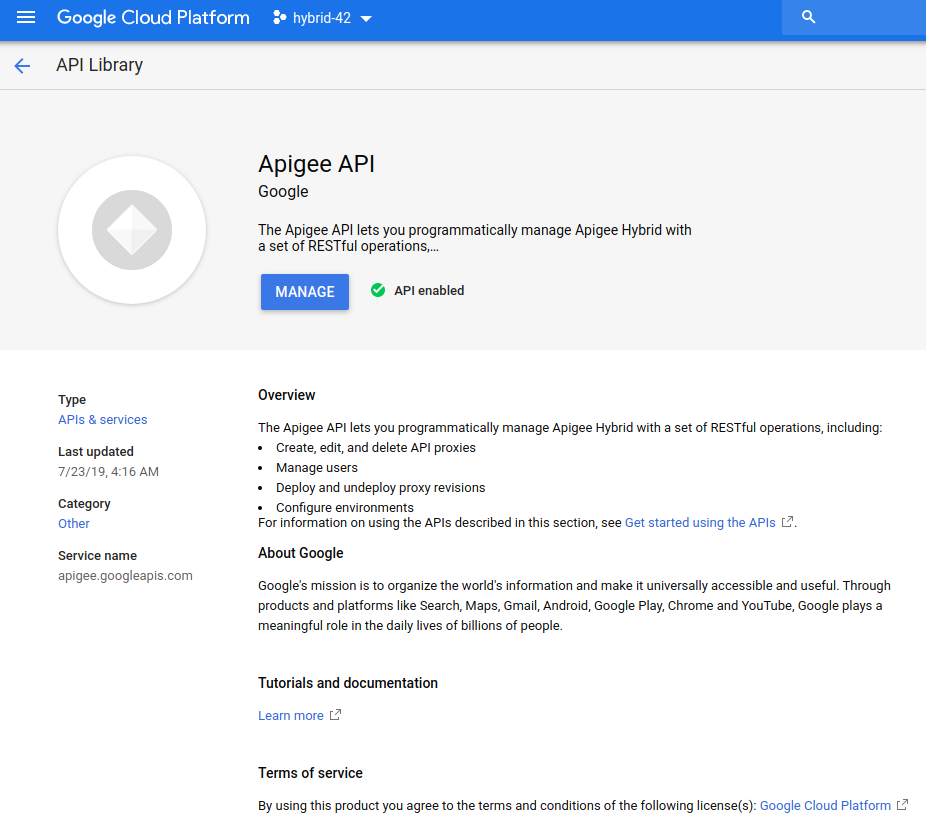 - Apigee API: ermöglicht die Kommunikation zwischen Ihrem Projekt und anderen Hybriddiensten und GCP APIs