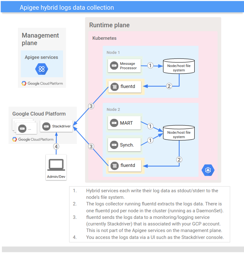 Setiap layanan platform runtime menulis data log ke stdout/stderr, dan Kubernetes menulis data ini ke sistem file host. Pengumpul log untuk hybrid berjalan di setiap node hybrid. Pengumpul adalah DaemonSet (direplikasi sekali dan hanya sekali per node) yang tugasnya mengumpulkan data log yang ditulis dan mengekspornya ke aplikasi Stackdriver Logging yang terkait dengan akun GCP Anda.