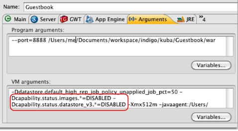 capabilitynamedengandatastore_v3dan tanda bintang (*) denganwrite, seperti ini:Dcapability.status.datastore_v3.write. Untuk kemampuan lainnya, biarkan tanda bintang seperti yang ditunjukkan.Screenshot di bawah ini menunjukkan dua kemampuan (datastore dan gambar) yang dinonaktifkan dari command line: