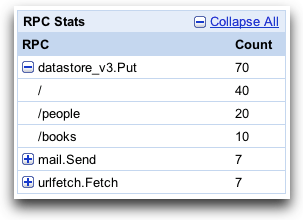Le SDK Python 2 inclut la bibliothèque Appstats utilisée pour profiler les performances RPC (Appel de procédure à distance) de votre application. Un RPC App Engine est un appel réseau aller-retour entre votre application et une API de service App Engine. Par exemple, tous les appels d'API suivants sont des appels RPC :