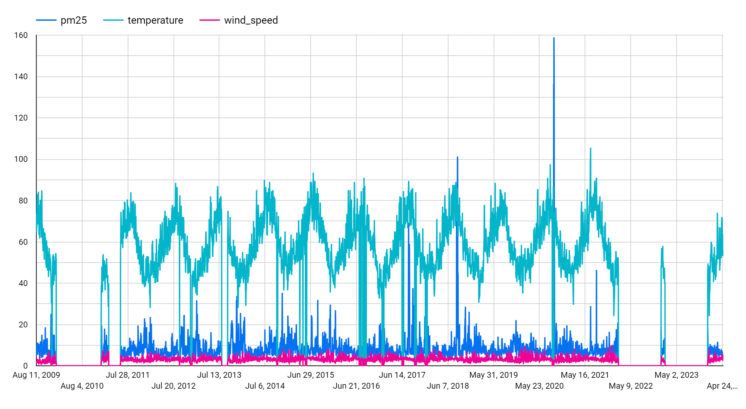 이 튜토리얼에서는 bigquery-public-data.epa_historical_air_quality 공개 데이터 세트의 데이터를 사용합니다. 이 데이터 세트에는 여러 미국 도시에서 수집된 일일 미세먼지 (PM2.5), 기온, 풍속 정보가 포함되어 있습니다.
