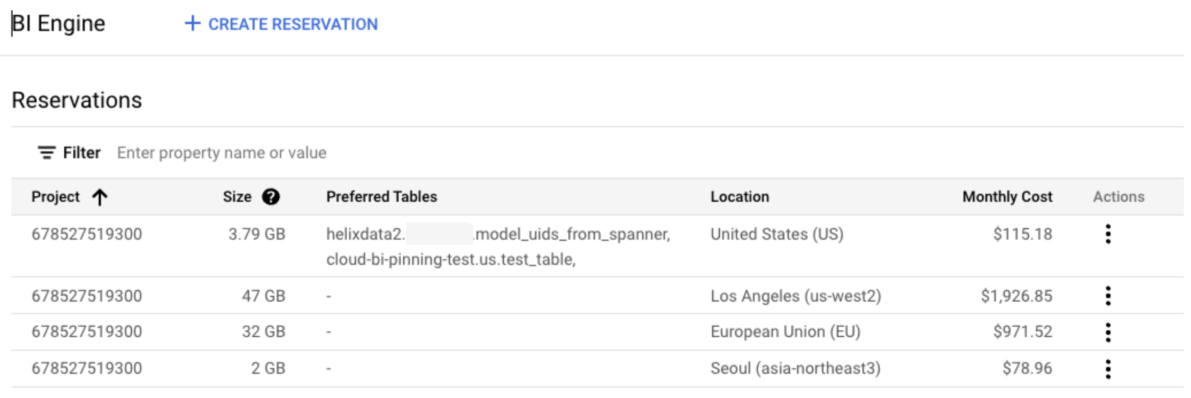 PROJECT_ID: ID opsional project yang akan mendapatkan manfaat dari akselerasi BI Engine. Jika dihilangkan, project default akan digunakan.LOCATION_ID: lokasi tempat data perlu di-cache, dengan awalanregion-. Contoh:region-us,region-us-central1.VALUE: ukuranINT64pemesanan untuk kapasitas BI Engine dalam gigabyte, 1 hingga 250 GB. Anda dapat meminta peningkatan kapasitas pemesanan maksimum untuk project Anda. Peningkatan pemesanan tersedia di sebagian besar wilayah, dan dapat memerlukan waktu pemrosesan antara 3 hari hingga satu minggu. MenetapkanVALUEakan menggantikan nilai yang sudah ada, jika ada. Menetapkan keNULLakan menghapus nilai untuk opsi tersebut.TABLE_PROJECT_ID.DATASET.TABLE: daftar opsional tabel pilihan tempat akselerasi harus diterapkan. Format:TABLE_PROJECT_ID.DATASET.TABLE or DATASET.TABLE. Jika project dihilangkan, maka project default akan digunakan.