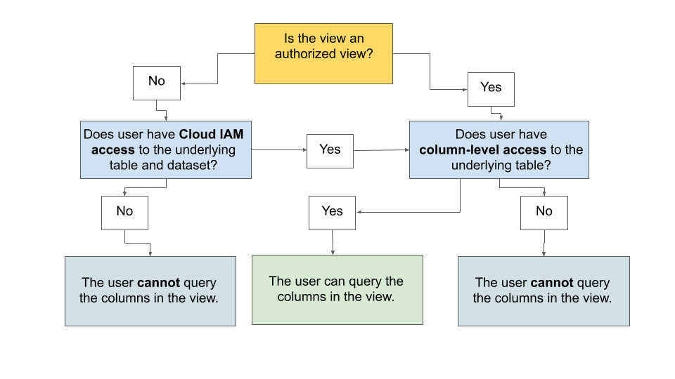 If the user has IAM access to the view's underlying tables and dataset as well as column-level access to the view's underlying tables, then the user can query the columns in the view. Otherwise, the user cannot query the columns in the view.