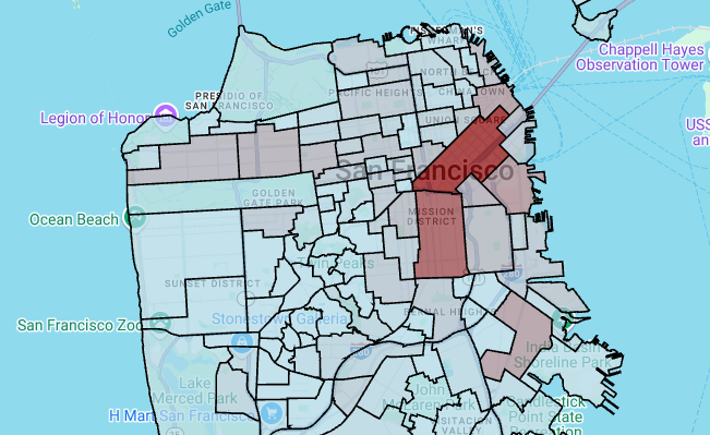 # Render the polygon layer. polygon_layer = pdk.Layer( 'PolygonLayer', id="bike_stations_choropleth", data=gdf_stations_x_neighborhood, get_polygon='polygon', get_fill_color='fill_color', get_line_color=[0, 0, 0, 255], get_line_width=50, pickable=True, stroked=True, filled=True, ) view_state = pdk.ViewState(latitude=37.77613, longitude=-122.42284, zoom=12) display_pydeck_map([polygon_layer], view_state)