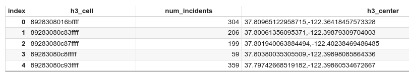 geopandasDataFrame,并为热图图层添加每个六边形的中心点,请输入以下代码:# Compute the cell for each incident's latitude and longitude. H3_RESOLUTION = 9 gdf_incidents['h3_cell'] = gdf_incidents.geometry.apply( lambda geom: h3.latlng_to_cell(geom.y, geom.x, H3_RESOLUTION) ) # Aggregate the incidents for each hexagon cell. count_incidents = gdf_incidents.groupby(by='h3_cell')['unique_key'].count().rename('num_incidents') # Construct a new geopandas.GeoDataFrame with the aggregate results. # Add the center of each hexagon for the HeatmapLayer to render. gdf_incidents_x_cell = gpd.GeoDataFrame(data=count_incidents).reset_index() gdf_incidents_x_cell['h3_center'] = gdf_incidents_x_cell['h3_cell'].apply(h3.cell_to_latlng) gdf_incidents_x_cell.info()