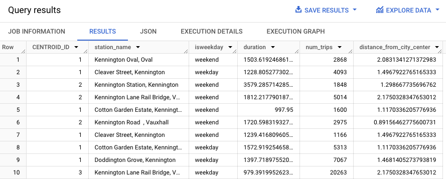 這項查詢會擷取自行車的租用資料 (包括 start_station_name 和 duration 資料欄),並將該資料與車站資訊結合。包括建立計算結果欄,其中包含車站與市中心的距離。然後,查詢會計算 stationstats 資料欄中的車站屬性 (包括平均騎乘時間和租用次數),以及計算出的 distance_from_city_center 資料欄。