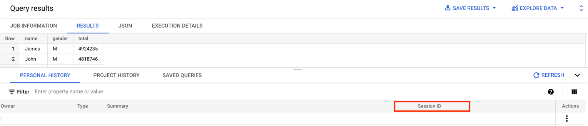 Google Cloud コンソールでセッションの履歴を表示するには、セッション ID で個人履歴またはプロジェクト履歴をフィルタして、特定のセッションで実行されたすべての SQL クエリを表示します。