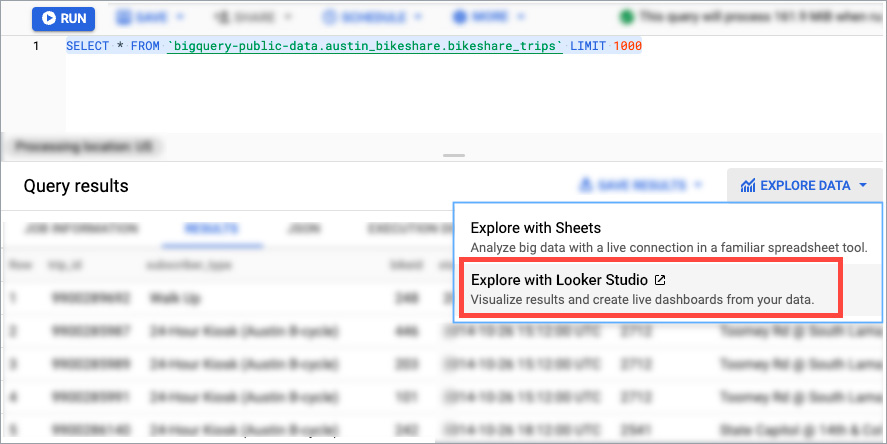 bigquery-public-datano campo Escreva para pesquisar.Aceda a bigquery-public-data > austin_bikeshare > bikeshare_trips.