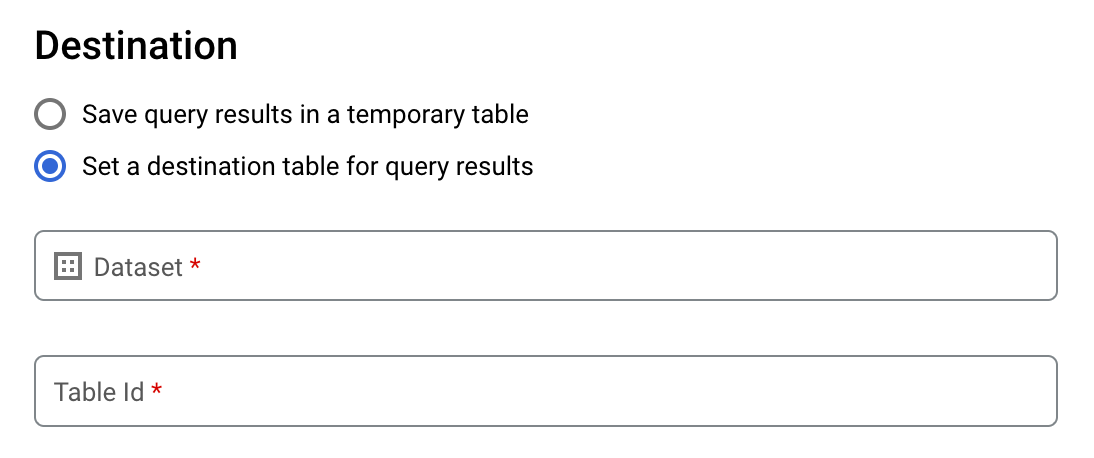 在目标部分,选择要在其中创建表的数据集,然后选择表 ID。