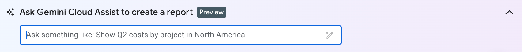 - Informes de costos: Si necesitas ayuda para encontrar o crear un informe de facturación que te permita obtener estadísticas sobre tus Google Cloud gastos, identificar tendencias clave y descubrir qué impulsa tus costos de Facturación de Cloud, usa la sugerencia de Gemini Cloud Assist disponible en la página Informes de Facturación de Cloud.