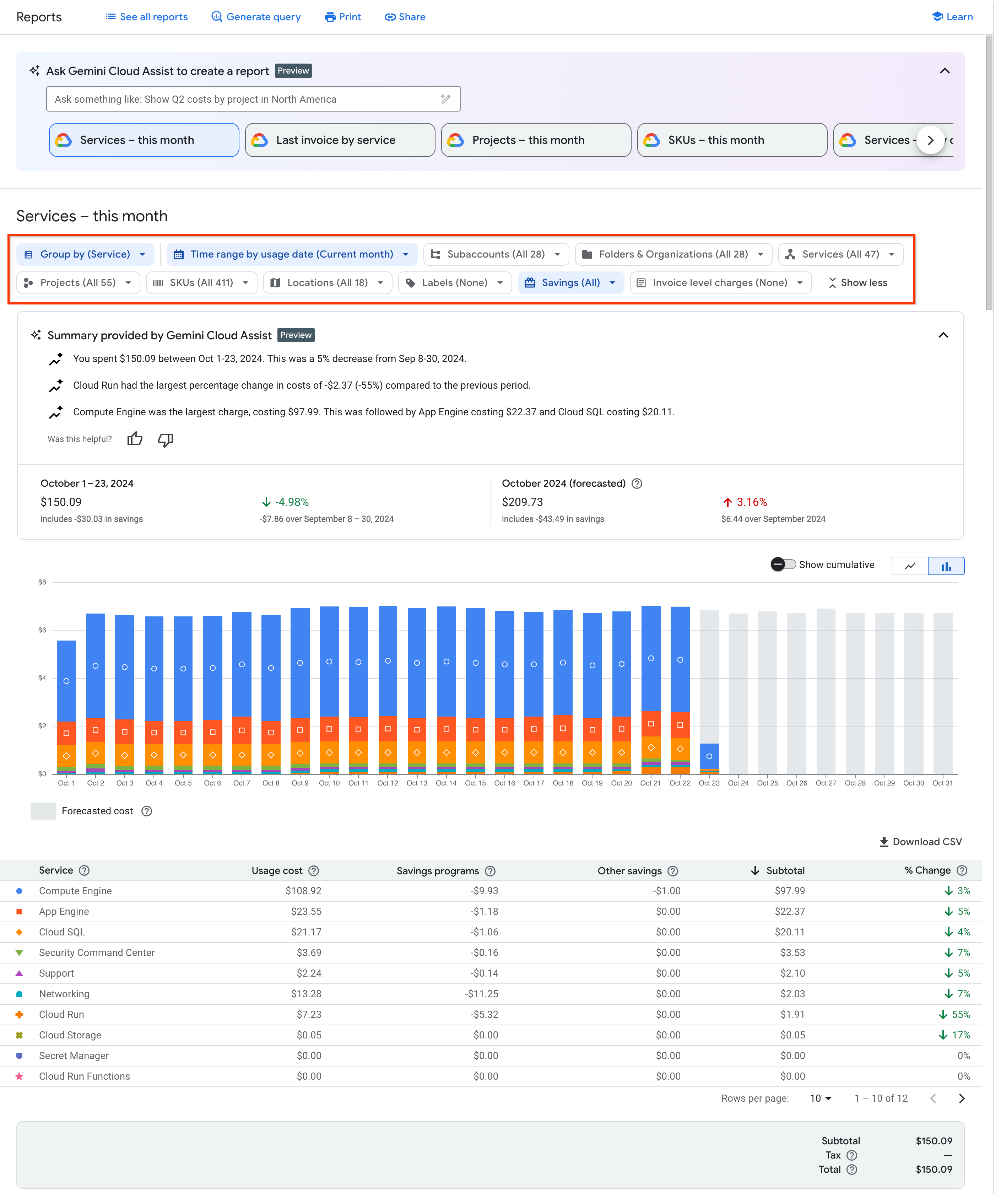 For a daily summary and breakdown of costs by service, view the report chart. The chart displays the current month's daily usage-specific costs grouped by service (for all Google Cloud projects), including any usage-specific savings applied.
