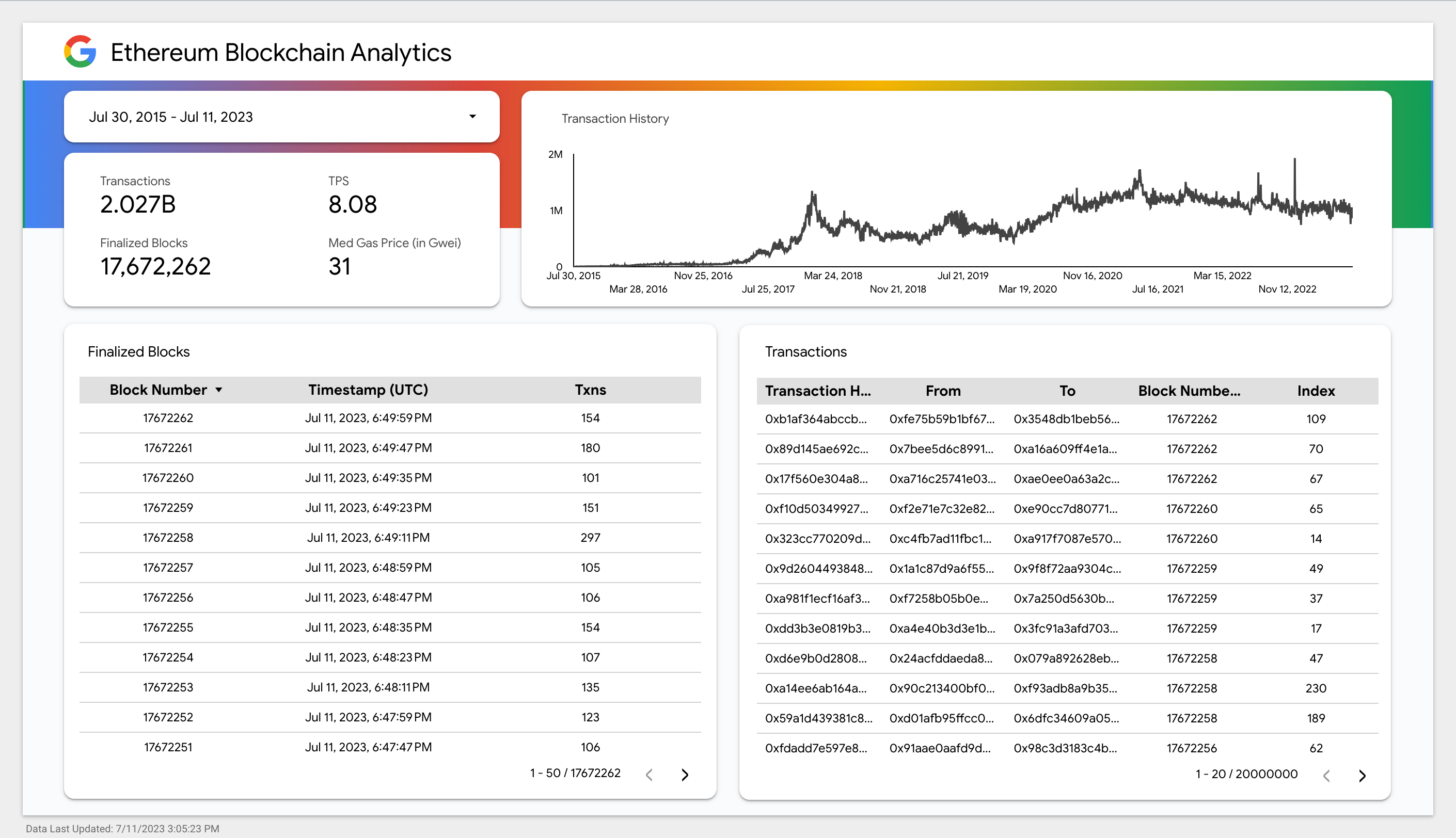 블록체인 분석을 사용하여 아름답고 대화형 대시보드를 지원하세요. 다음 대시보드는 blocks 및 transactions 테이블을 기반으로 이더리움 네트워크의 활동을 개략적으로 보여줍니다.