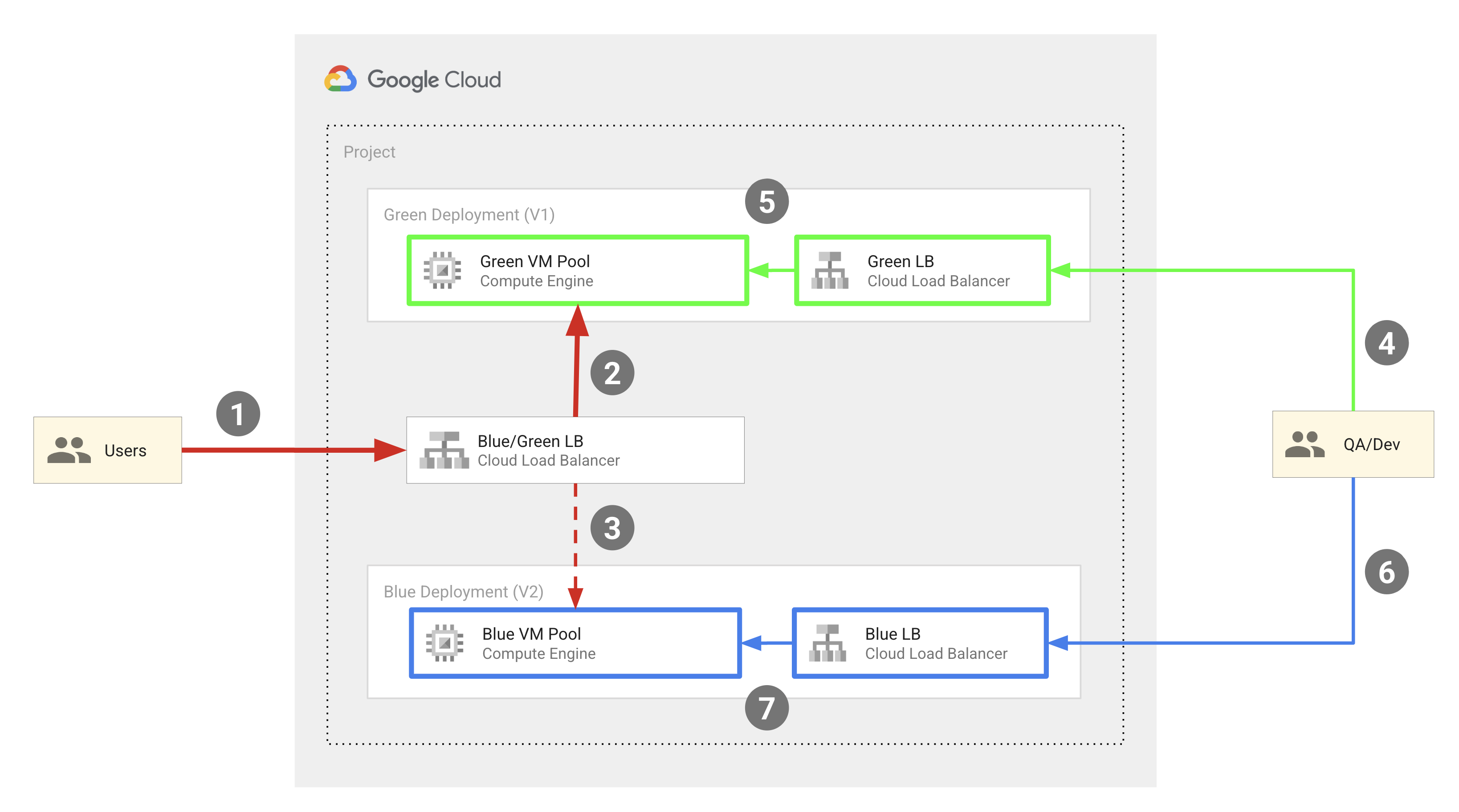 Ce guide explique comment effectuer des déploiements bleu/vert sans temps d'arrêt sur des groupes d'instances gérés (MIG) Compute Engine à l'aide de Cloud Build et de Terraform.