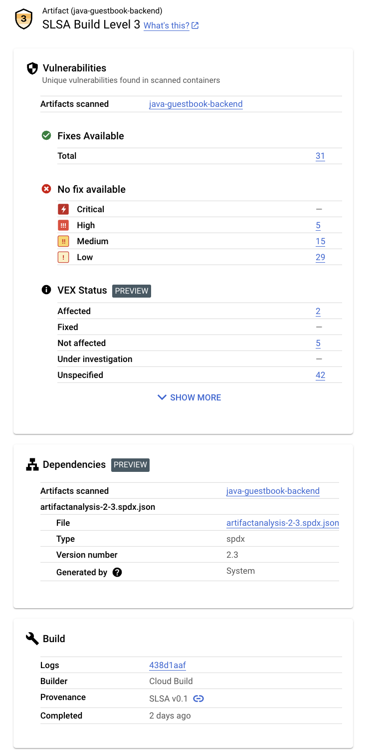 - Nivel de SLSA (Supply-chain Levels for Software Artifacts): identifica el nivel de madurez de tu proceso de compilación de software de acuerdo con la especificación de SLSA. Por ejemplo, esta compilación ha alcanzado el nivel 3 de SLSA.