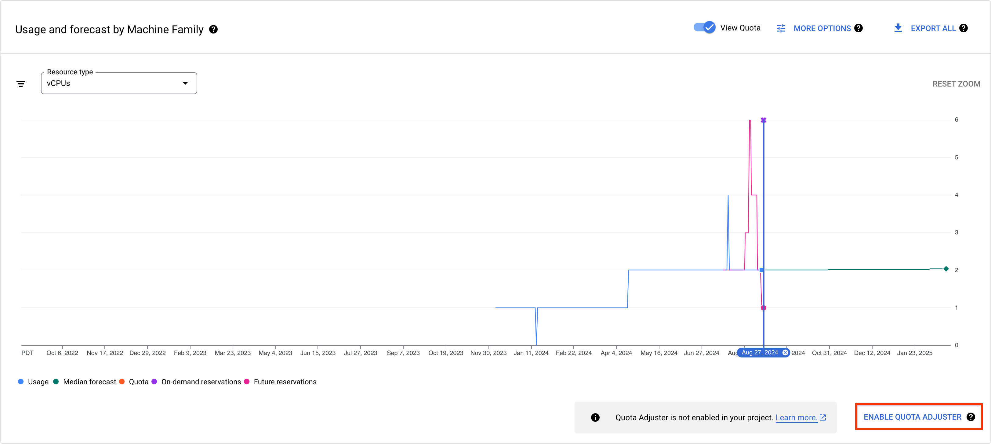 Capacity Planner lets you enable the quota adjuster in your project. This setting allows Google Cloud to automatically submit quota increase requests on your behalf when your quota nears a limit.