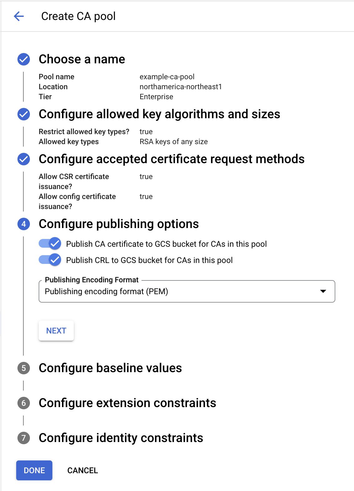 証明書発行ポリシーの構成について詳しくは、CA プールに証明書発行ポリシーを追加するをご覧ください。