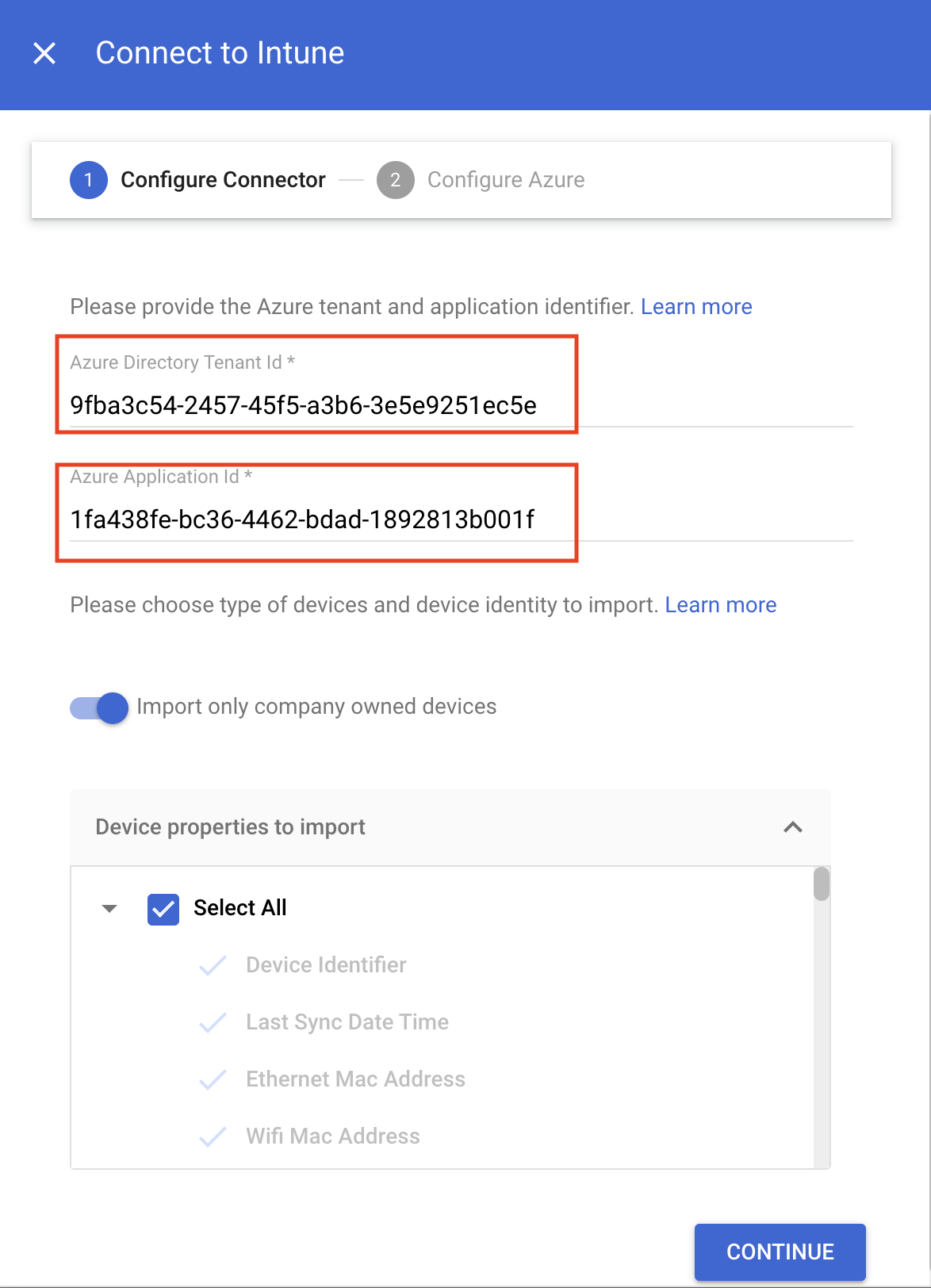 Geben Sie im Dialogfeld Mit Intune verbinden die Mandanten-ID in das Feld Azure-Verzeichnis-Mandanten-ID und die Anwendungs-ID in das Feld Azure-Anwendungs-ID ein.