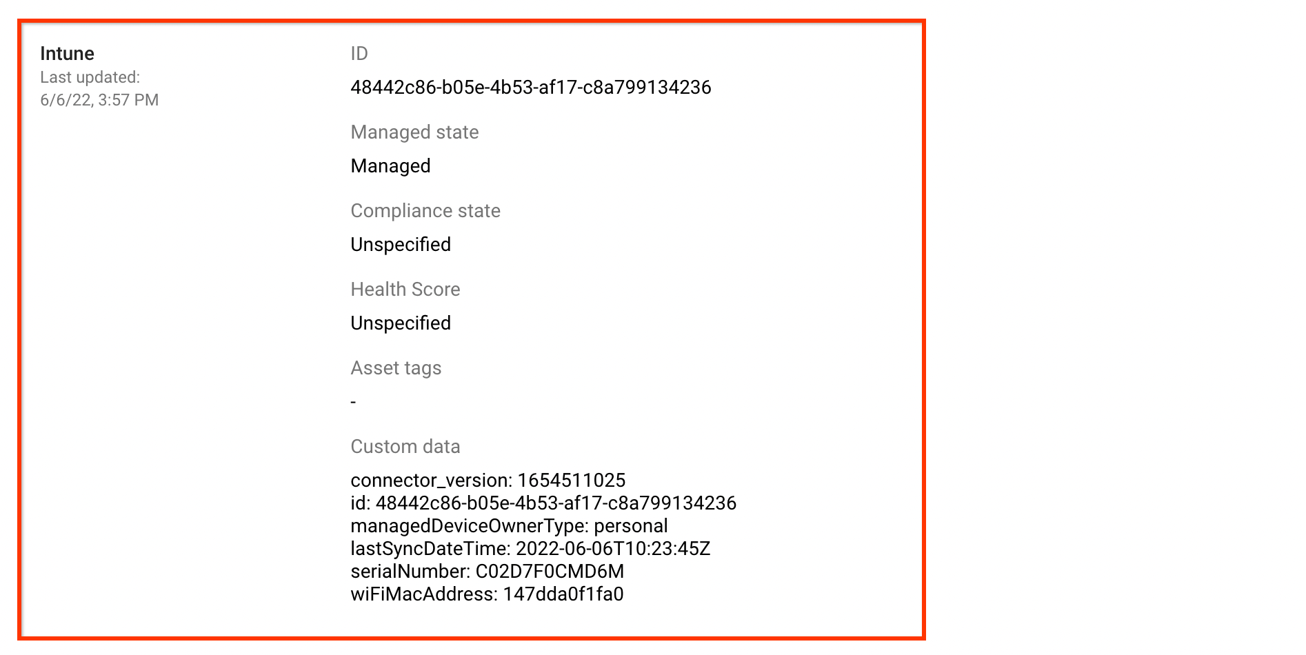 device identifier,last sync time,serial numberundwifi MAC addresswerden standardmäßig erfasst.Weitere Informationen zu den Geräteeigenschaften, die von Intune erfasst werden, finden Sie unter Intune-Geräteeigenschaften.