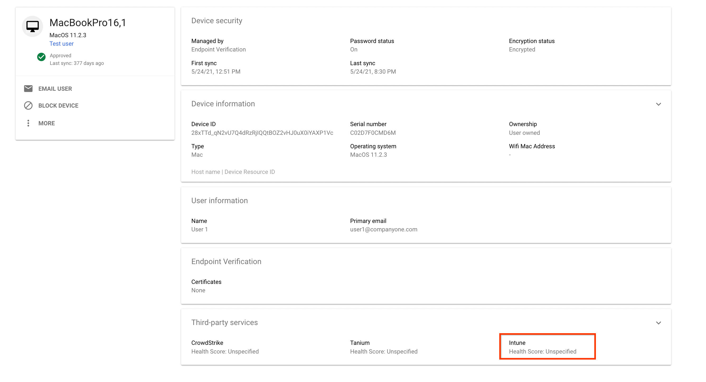 Microsoft Intune이 이제 보안 및 MDM 파트너 섹션에 나열됩니다. 조직의 크기에 따라 엔드포인트 확인과 Intune을 연결을 설정하는 데 몇 초 정도 걸릴 수 있습니다. 연결이 설정된 후 기기에서 Intune 데이터를 보고하는 데 몇 분에서 1시간 정도 걸릴 수 있습니다.