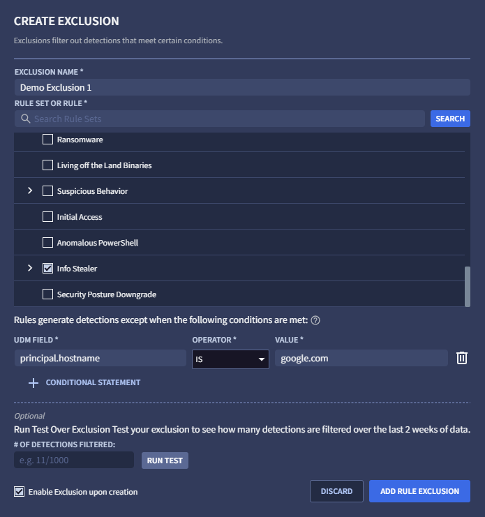 Anda mungkin mendapati bahwa deteksi pilihan yang disediakan oleh tim Google Cloud Threat Intelligence (GCTI) menghasilkan terlalu banyak deteksi. Anda dapat mengonfigurasi pengecualian pada aturan deteksi pilihan untuk membantu mengurangi volume deteksi ini. Pengecualian aturan hanya digunakan dengan deteksi yang dikurasi Google Security Operations.
