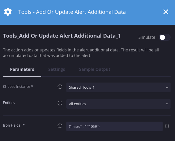 Adds or updates fields in the alert additional data. Results display in the Alerts overview, OFFENSE_ID field.