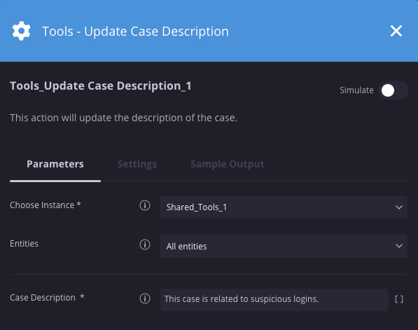 This example updates the case description to “This case is related to suspicious logins.“.