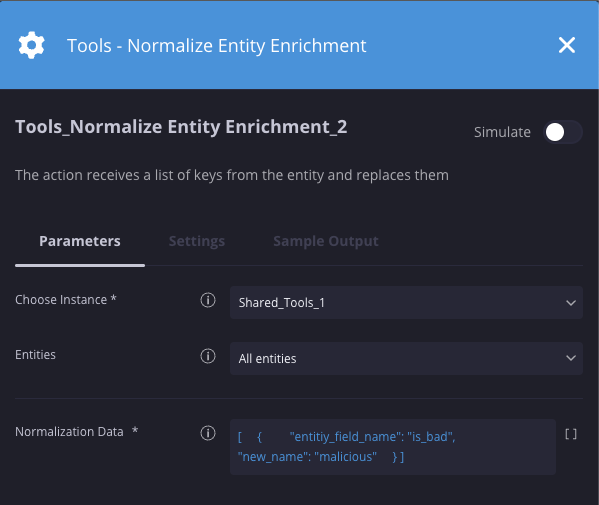 | Normalization data | JSON | N/A | Yes | Specify the JSON in the following format example: [ { "entity_field_name": "AT_fields_Name", "new_name": "InternalEnrichment_Name" }, { "entity_field_name": "AT_fields_Direct-Manager", "new_name": "InternalEnrichment_DirectManager_Name" }, { "entity_field_name": "AT_Manager_fields_Work-Email", "new_name": "InternalEnrichment_DirectManager_Email" } ] |