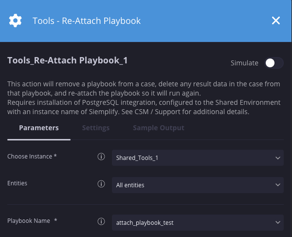 Removes a playbook from a case, deletes any result data in the case from that playbook, and re-attaches the playbook so it will run again. Requires installation of PostgreSQL integration, configured to the Shared Environment with an instance name of Google SecOps SOAR. See CSM / Support for additional details.