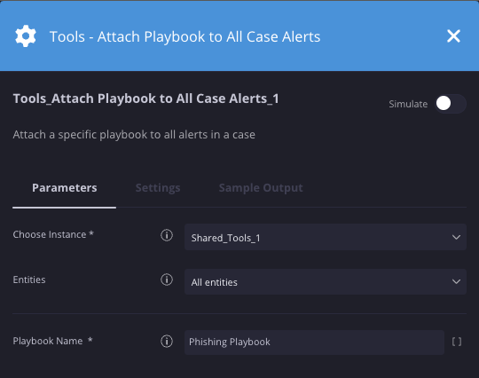 | Playbook Name | String | N/A | Yes | Playbook or block name to add to all case alerts. |