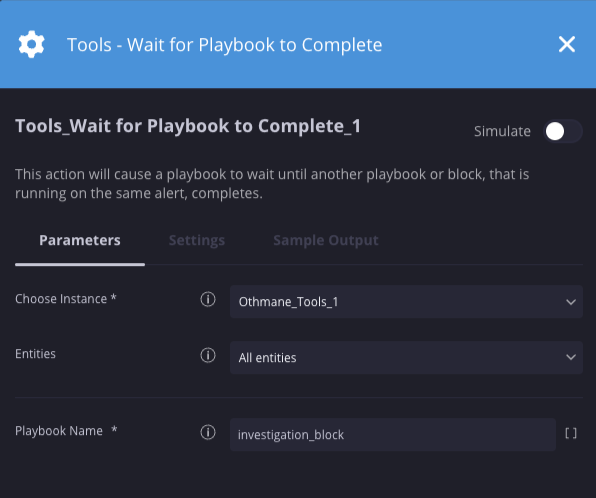 In this scenario, we're pausing the current playbook until the “investigation block” that’s running on the same alert is complete.